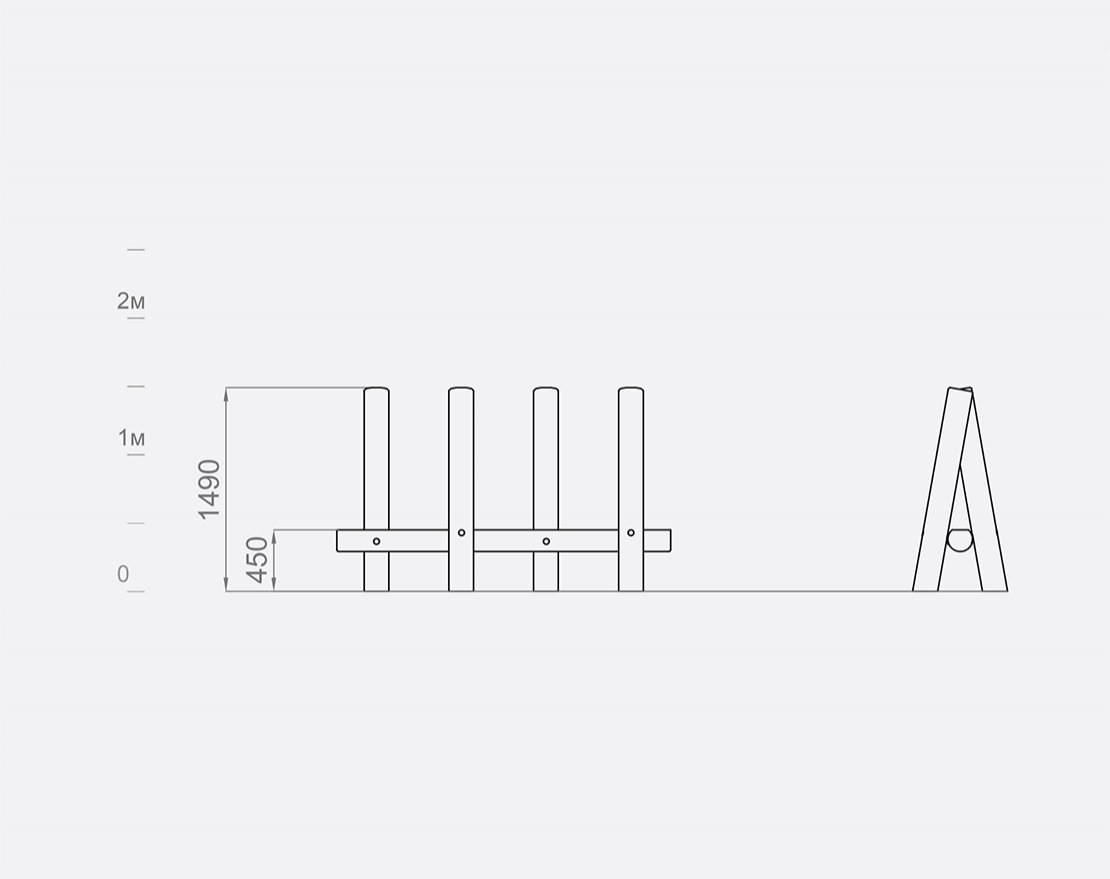 Состоит из опорных столбов и перекладины. Крепежные элементы закрыты составными колпачками и заглушками.