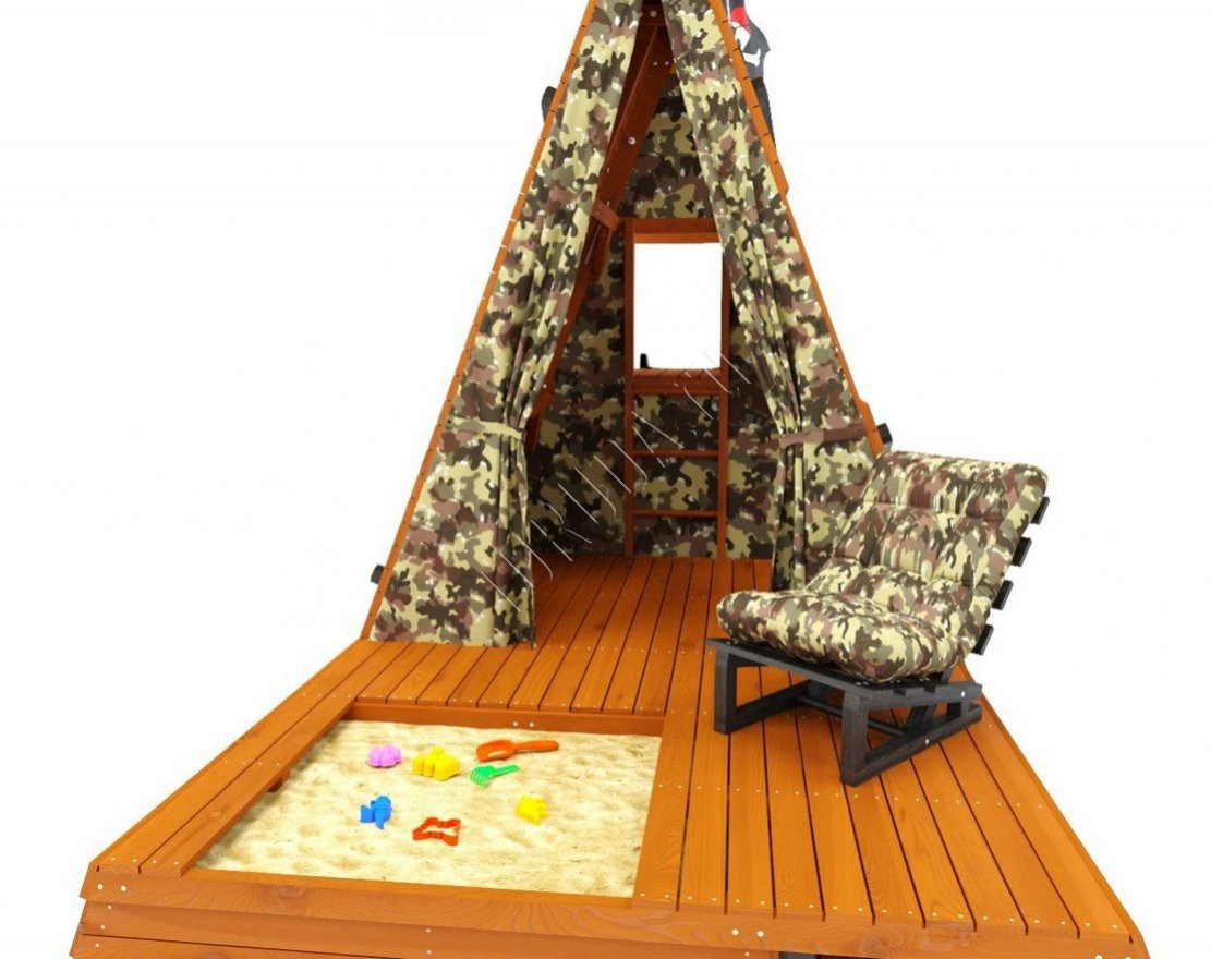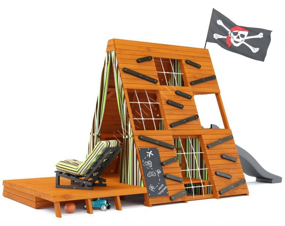 - Пиратский флаг, кресло-лежак складное с 3 положениями спинки для детей и родителей, а также подушка с фиксаторами-липучками в красивом цвете – всё это поможет детям расслабиться после активной игры и создаст неповторимую атмосферу приключений и фантазии.