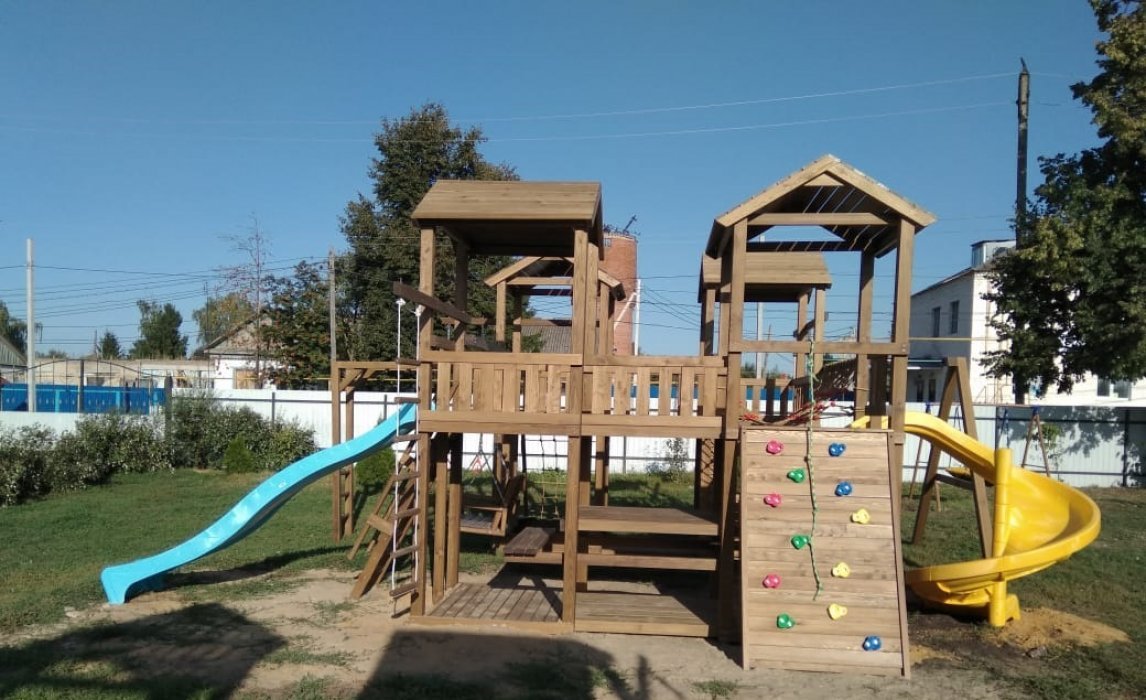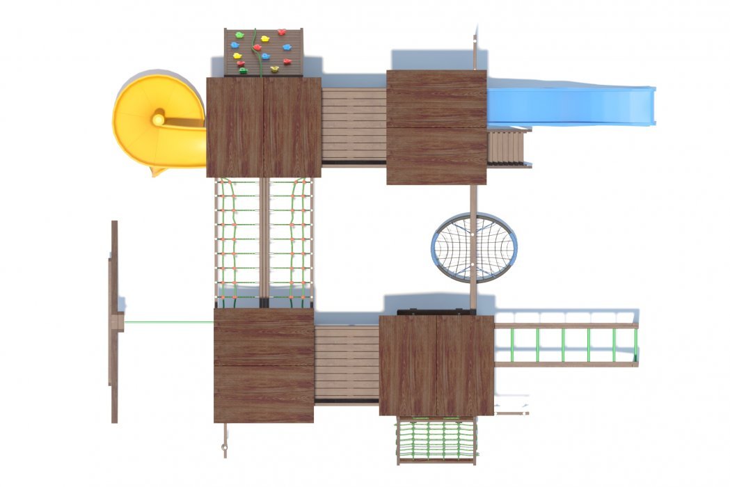 Основа детской игровой - спортивной конструкции – четыре башни с игровой платформой соединены мостиками и качельной балкой. Конструкция оснащена двускатными деревянными крышами, встроенным домиком, встроенным столиком с лавками, встроенной песочницей и дополнительной платформой в нижней части конструкции, пластиковыми волнообразным скатом и винтовым скатом с превосходной скользящей поверхностью, деревянной лестницей, широким скалодромом, канатной лестницей, деревянным рукоходом, шведской стенкой, сидением качели «гнездо», гимнастическим канатом, гимнастическими кольцами и подвесной лестницей. Для безопасности ребенка предусмотрены перила на лестнице, заборчики и ограждения над зонами препятствий (скалодром, канатная лестница, скат).