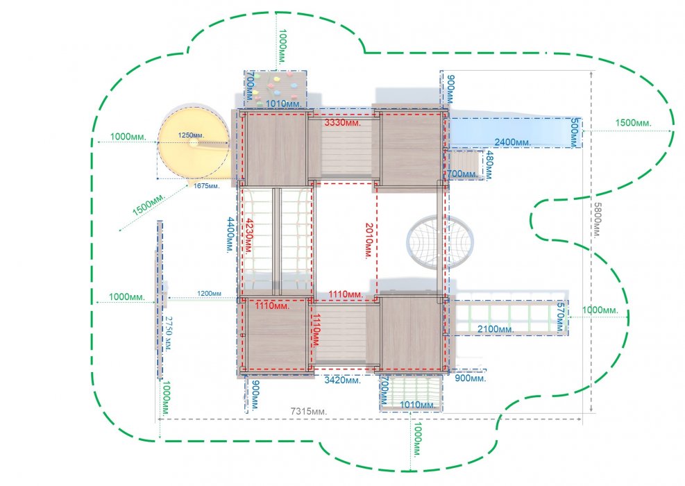 Площадь поверхности детской площадки = габариты конструкции по крайним точкам + 1000/1500мм. по периметру конструкции. Поверхность должна быть твердой, ровной, свободной от насаждений, горизонтальной без перепадов, допустимый уклон не более 20мм. на 10п.м.