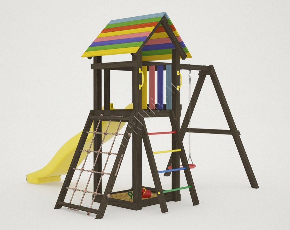 - Домик закрыт сверху деревянным перекрытием – оно скрывает от прямых солнечных лучей и позволяет передохнуть на свежем воздухе. Комплекс универсален, поскольку включает в себя столь любимые детьми горку и качели.