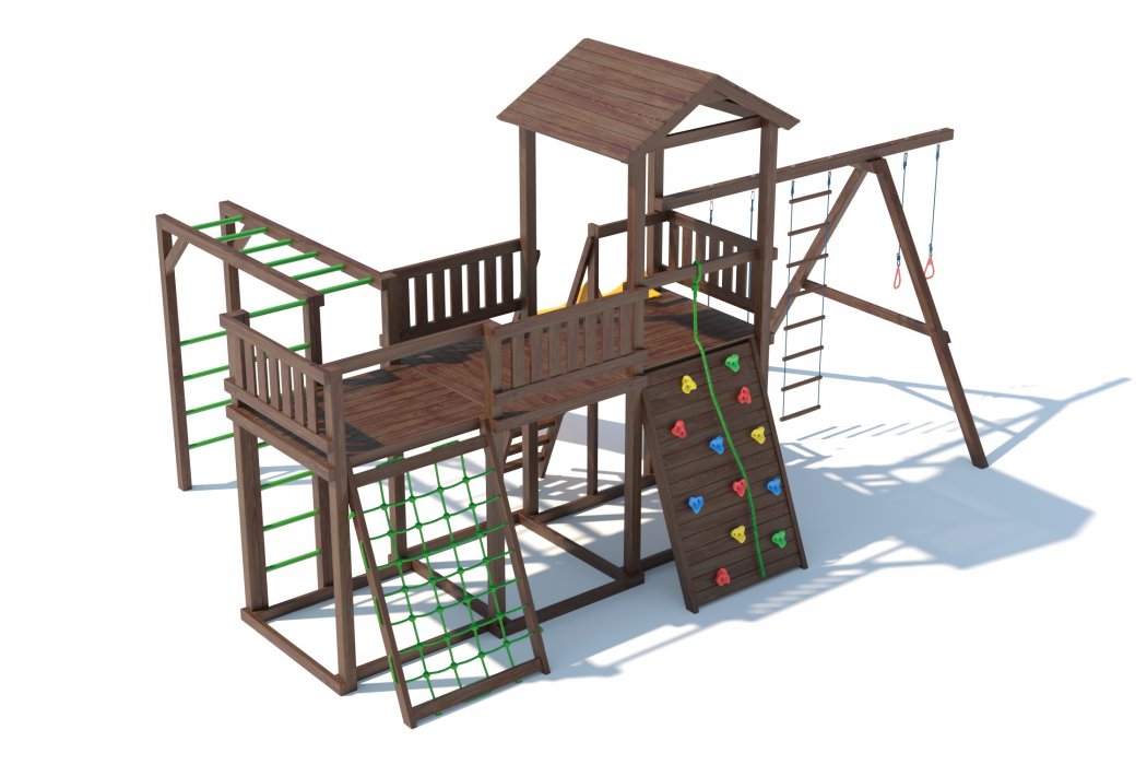 Основа детской игровой - спортивной конструкции - башня с террасой и игровой платформой. Конструкция оснащена двускатной деревянной крышей, пластиковым волнообразным скатом с превосходной скользящей поверхностью, деревянной лестницей, широким скалодромом, канатной лестницей, деревянным рукоходом, шведской стенкой, приставными качелями, сидением качели, гимнастическими кольцами, подвесной лестницей. Для безопасности ребенка предусмотрены перила на лестнице, заборчики и ограждения над зонами препятствий (скалодром, канатная лестница, скат).