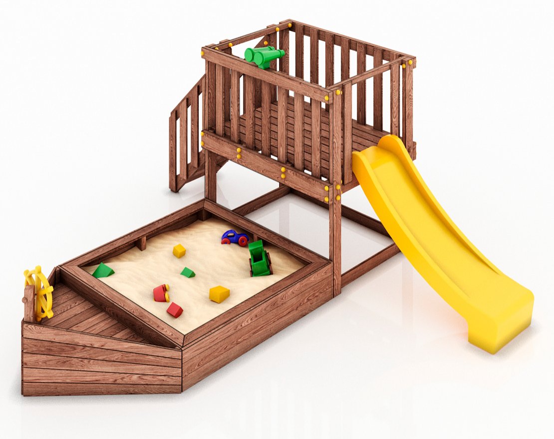 Детская песочница-кораблик и капитанский мостик с горкой с высоты 900 мм.