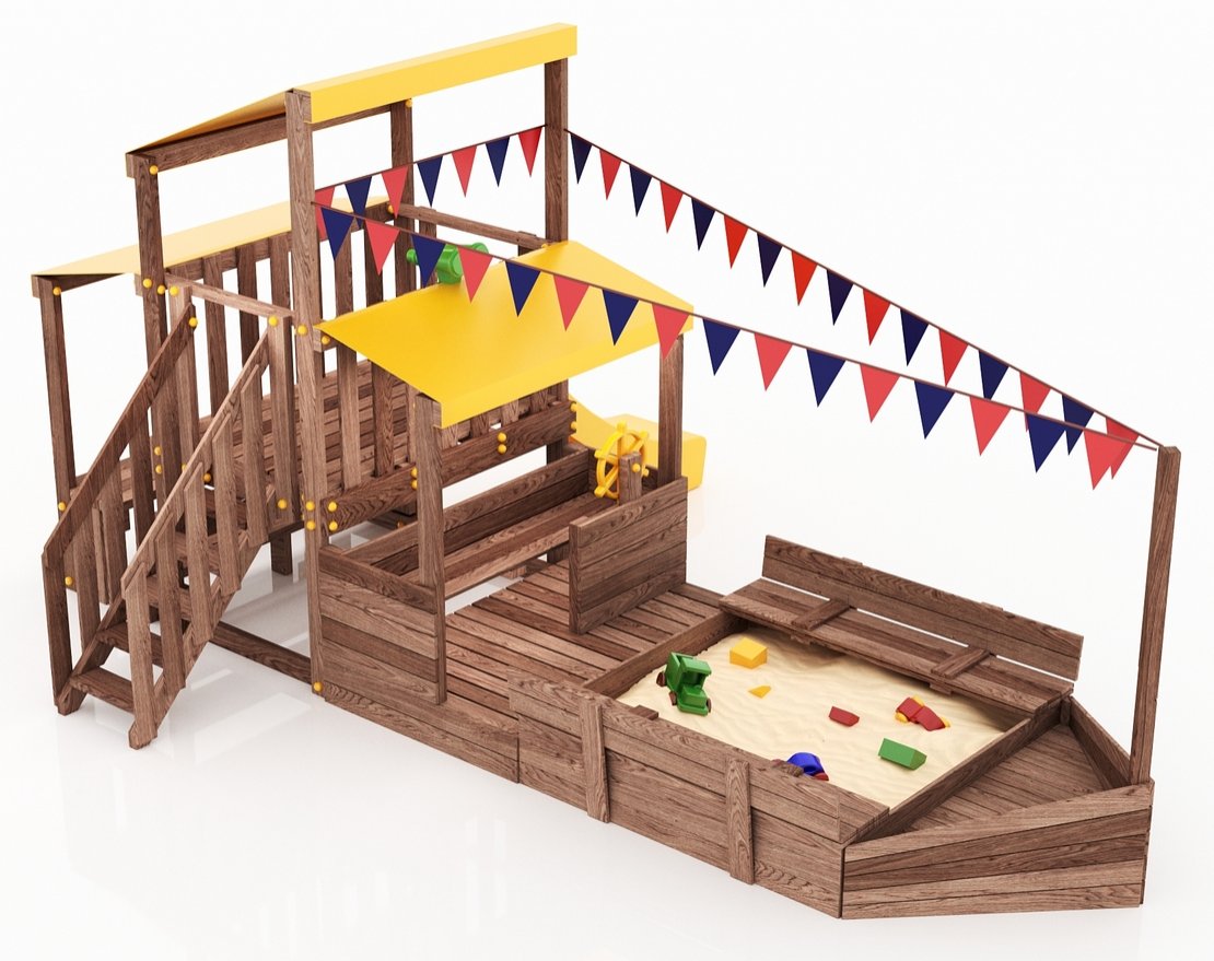 Детская песочница с крышкой-лавочкой и кораблик, включающий в себя штурманскую рубку и капитанский мостик с горкой с высоты 900 мм с флажками.