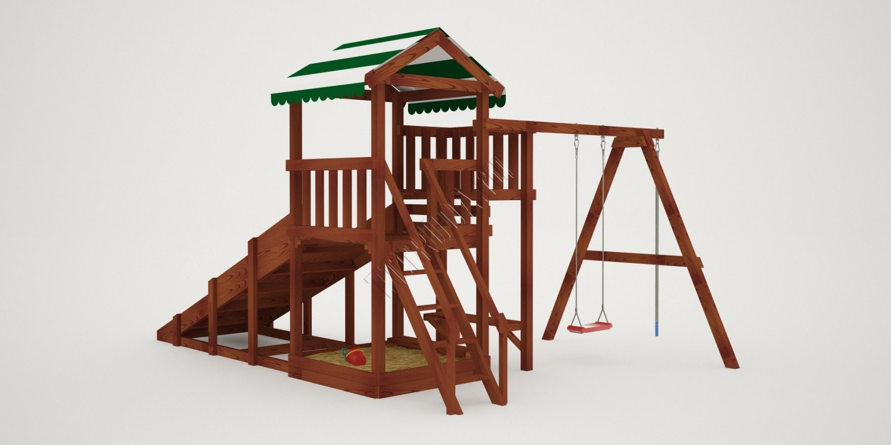 Также в модели есть еще один дополнительный канат для полноценного лазания – он расположен слева от качелей. Для любителей более спокойных игр предусмотрена песочница с удобной лавочкой для игральных принадлежностей.